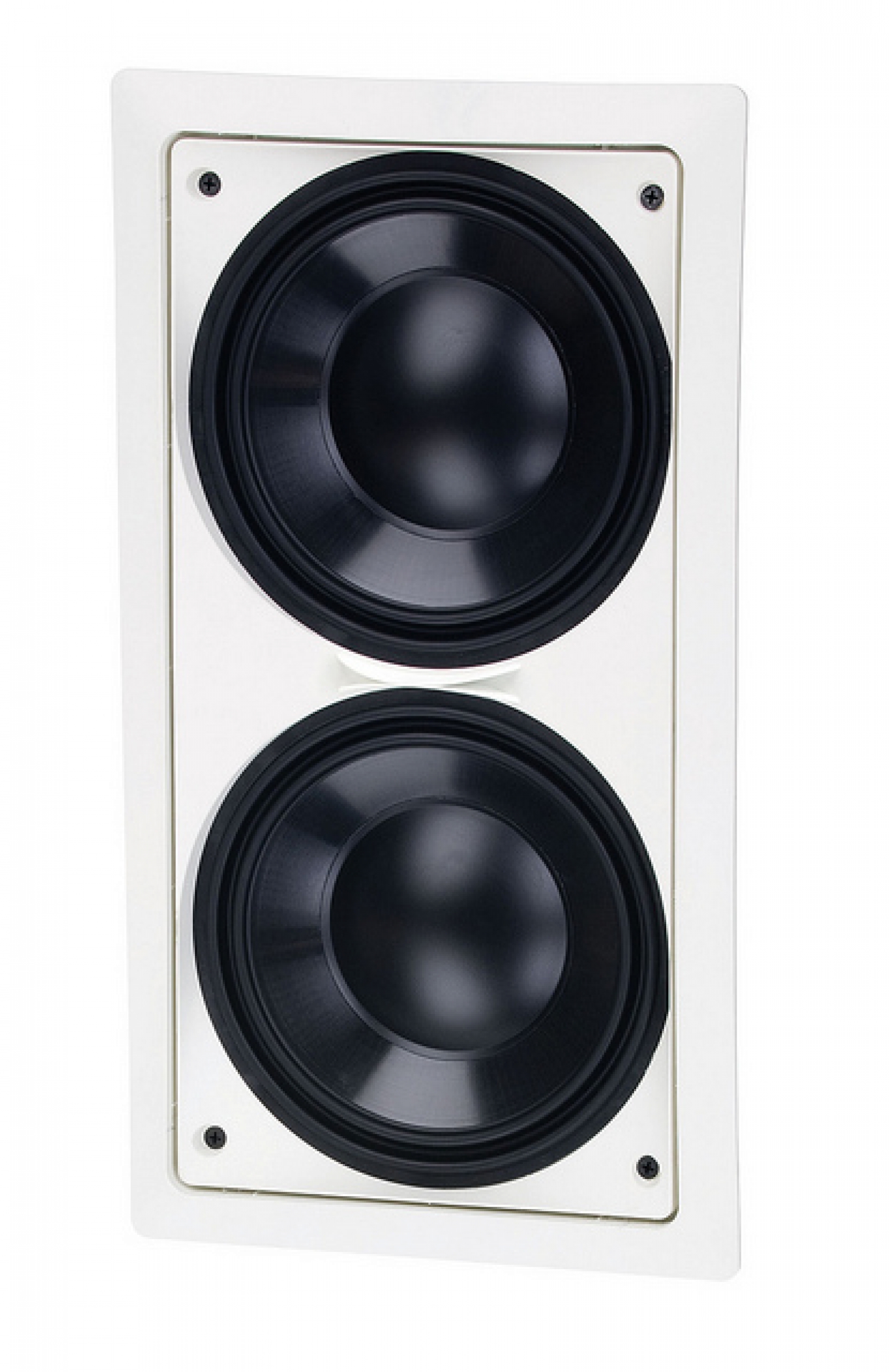 Kettős, nagy membránkilengésű, GRIP™ hangszórókosárba szerelt hangszóróval készült falba építhető mélynyomó, szerelőkampókkal. |